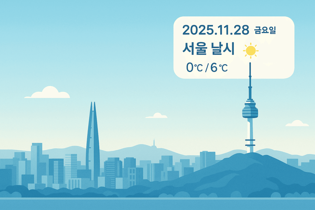 2025년 11월 28일 서울날씨 11월 28일 서울은 맑고 차분한 초겨울 날씨가 이어집니다. 아침 공기는 차갑지만, 한낮에는 햇살이 부드럽게 퍼지면서 체감