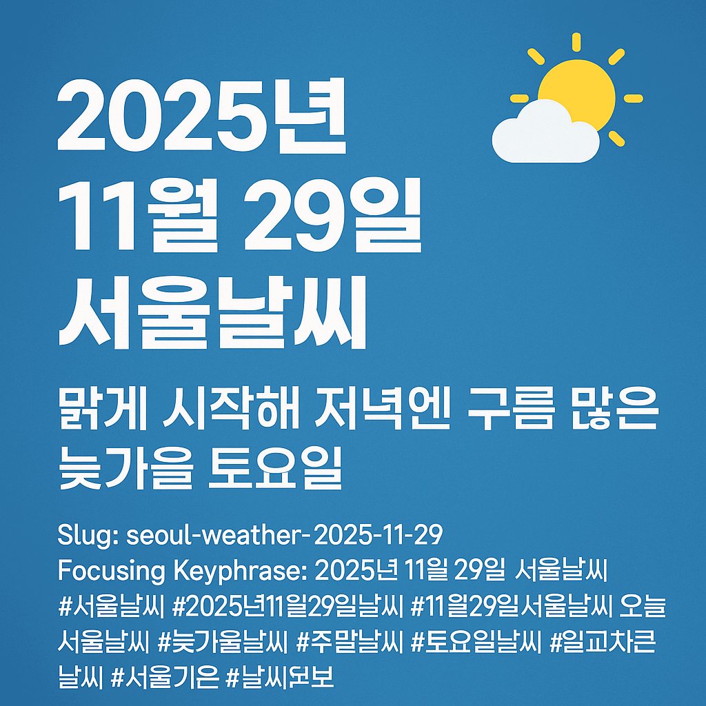 2025년 11월 29일 서울날씨 – 맑게 시작해 저녁엔 구름 많은 토요일 업데이트: 2025-11-29 · 기준: 기상청 단기예보 오늘 한눈에 보기