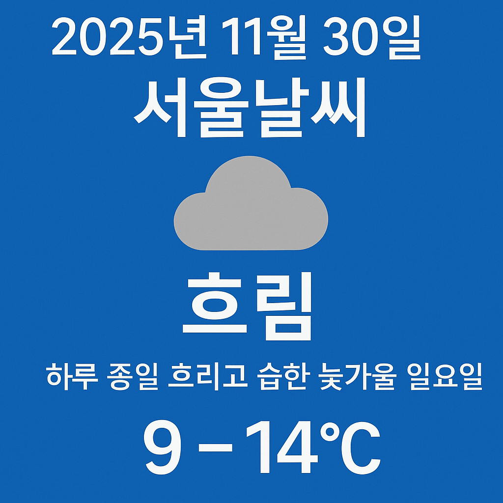 2025년 11월 30일 서울날씨 – 흐리고 습한 11월의 마지막 날 2025년 11월 30일, 일요일인 오늘 서울은 하루 종일 흐린 하늘이