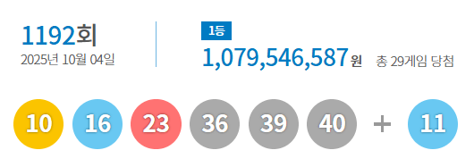 2025년 10월 4일 제1192회 로또 1등 당첨번호 발표
