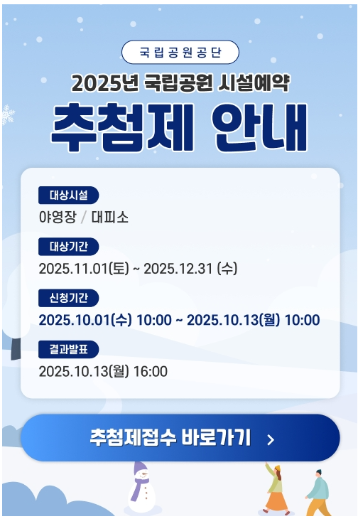 | 야영장 / 대피소 | 추첨제 | 매월 오픈 일정 공지 |