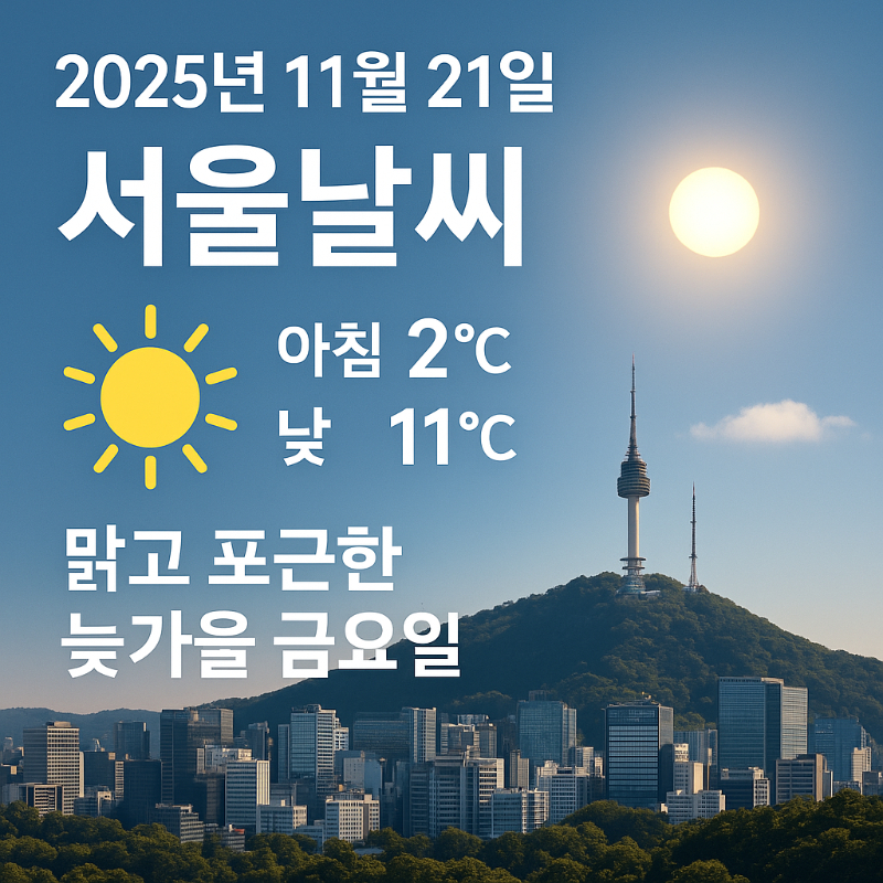 🌤️ 2025년 11월 21일 서울날씨 – 아침 쌀쌀, 오후 온화한 늦가을 금요일 업데이트: 2025-11-21 · 서울 오늘 요약 시간대별 예보
