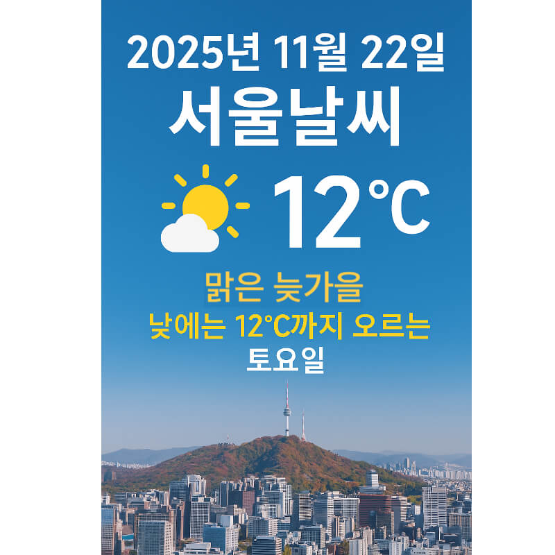 🌤️ 2025년 11월 22일 서울날씨 – 맑은 늦가을, 낮에는 12℃까지 오르는 토요일 업데이트: 2025-11-22 · 서울 오늘 요약 시간대별 예보